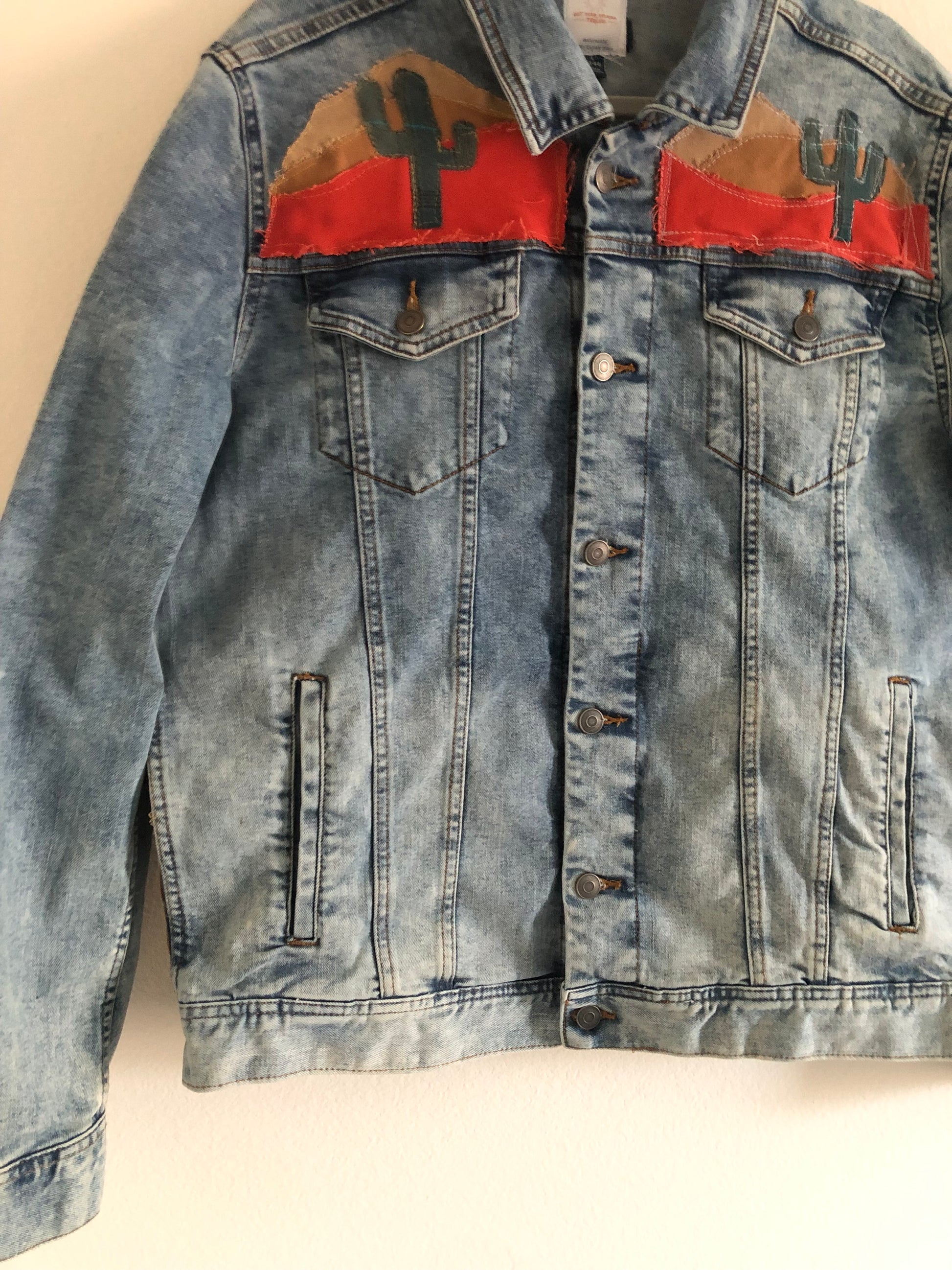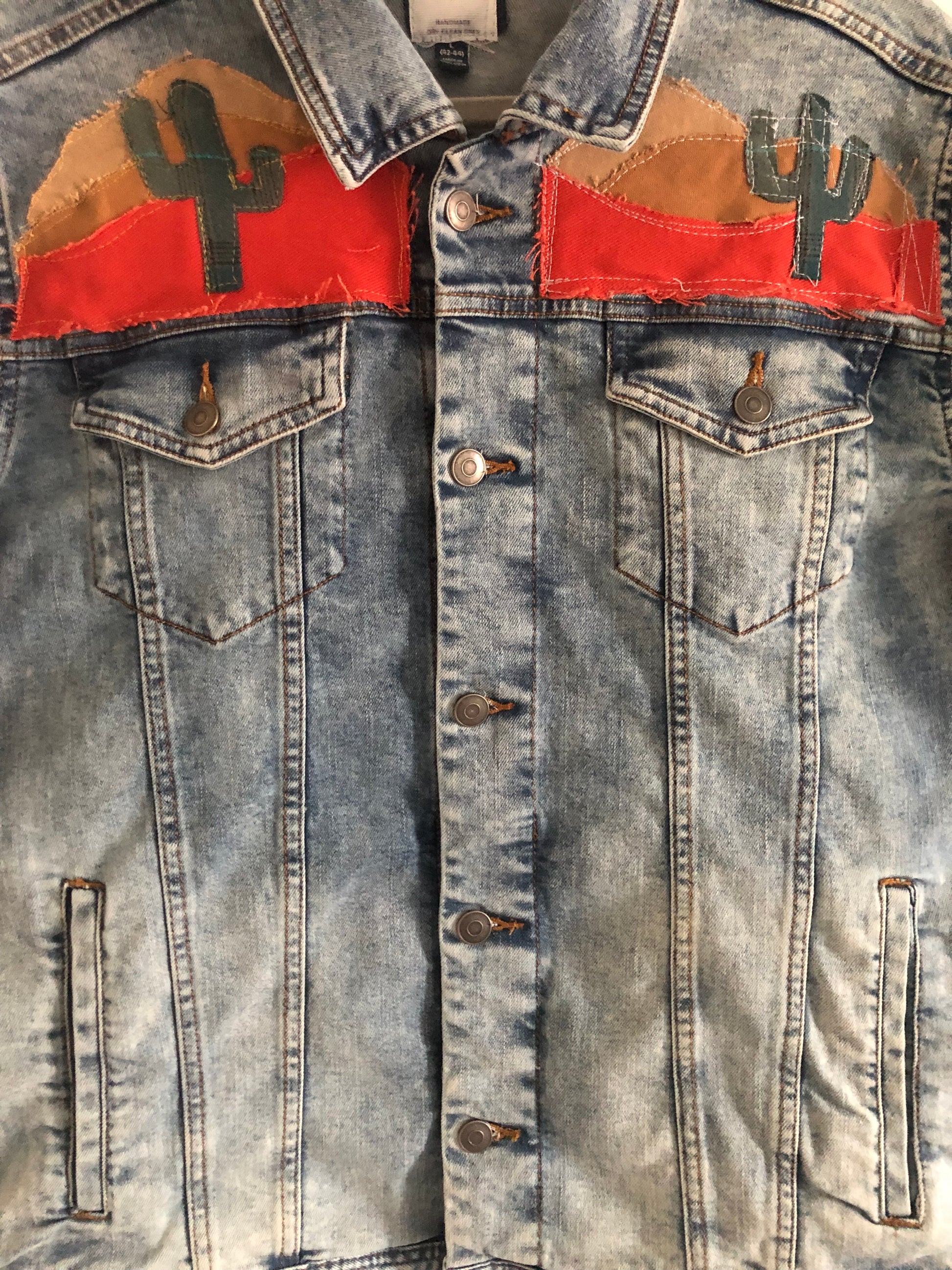 The Avalon Horn Jacket is a tribute to the rugged beauty of Catalina Island, where ocean waters meet sunbaked cliffs and wild bighorn sheep roam the high ridges. On the back, the powerful horns of the ram rise above a landscape stitched in earthen browns, ocean blues, and sunset reds — a patchwork horizon echoing the island’s timeless vistas. The front carries quiet desert details, with cacti and warm tones layered like the fading light over Avalon. This jacket is both a keepsake and a journey, a one-of-a-kind piece that captures the spirit of the island — bold, untamed, and enduring.
