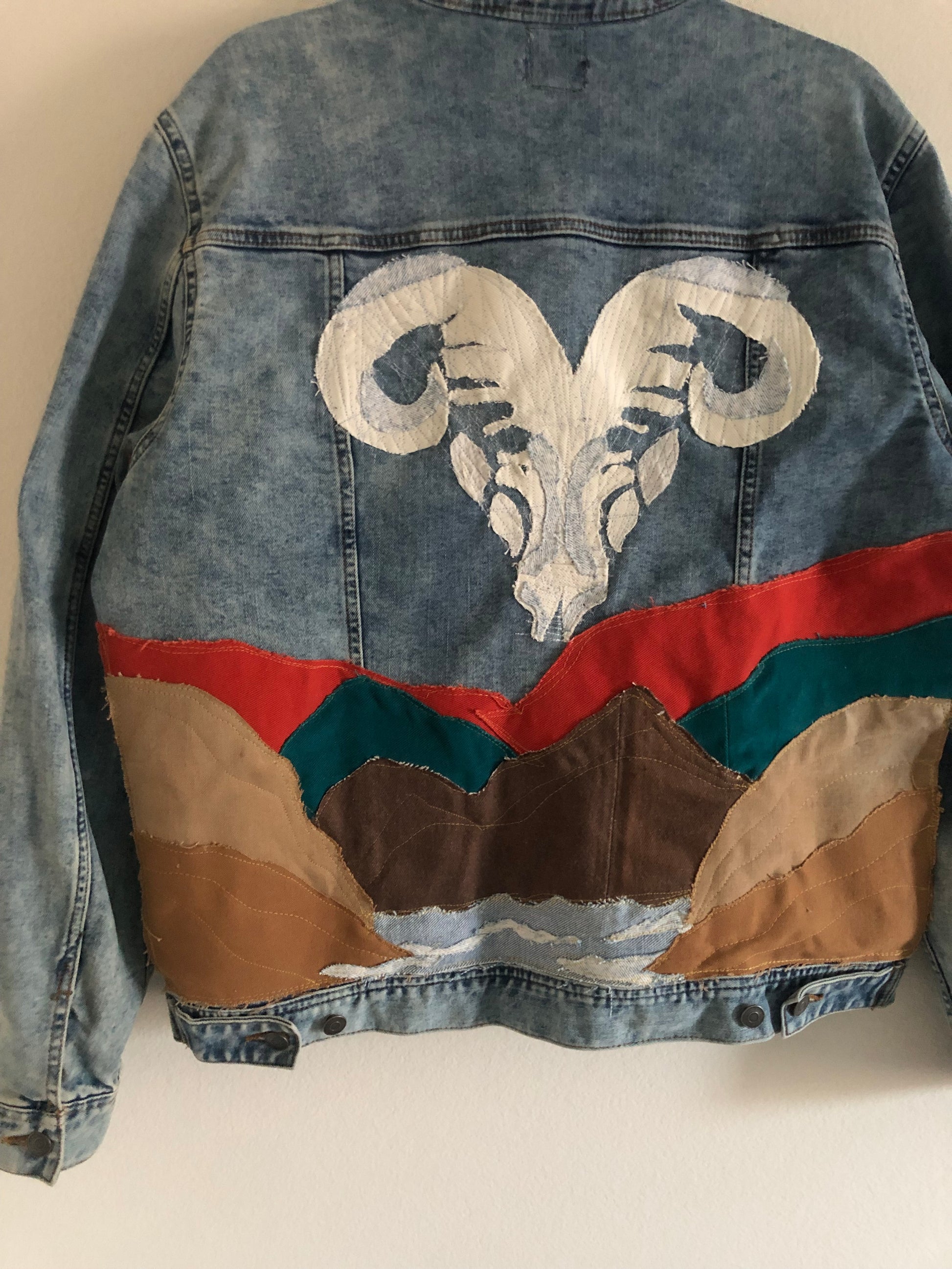 Back Design: Hand-cut and sewn appliqué landscape with bold ram skull centerpiece
