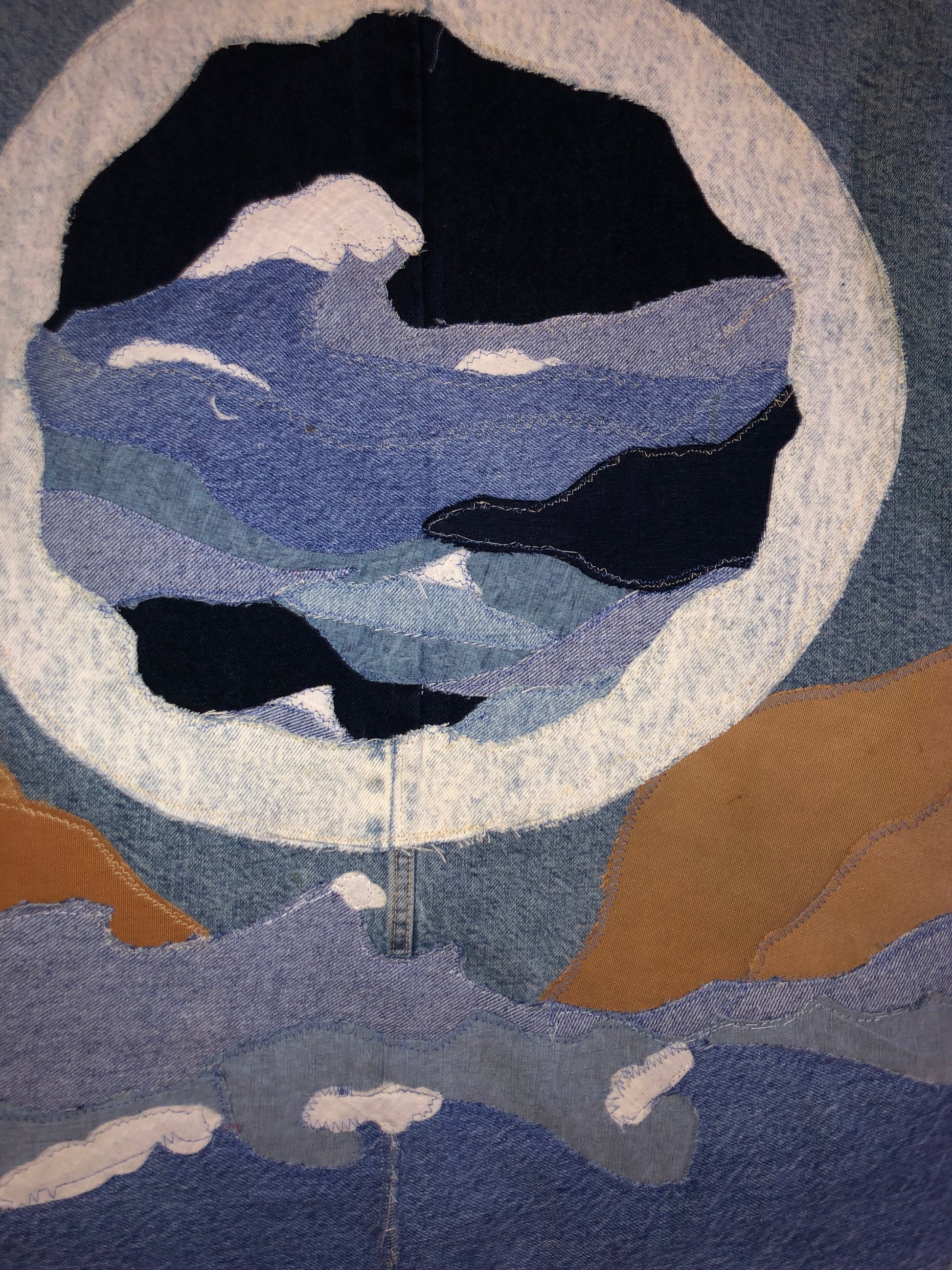 Design: Hand-cut & sewn denim patchwork, collage-style landscape
