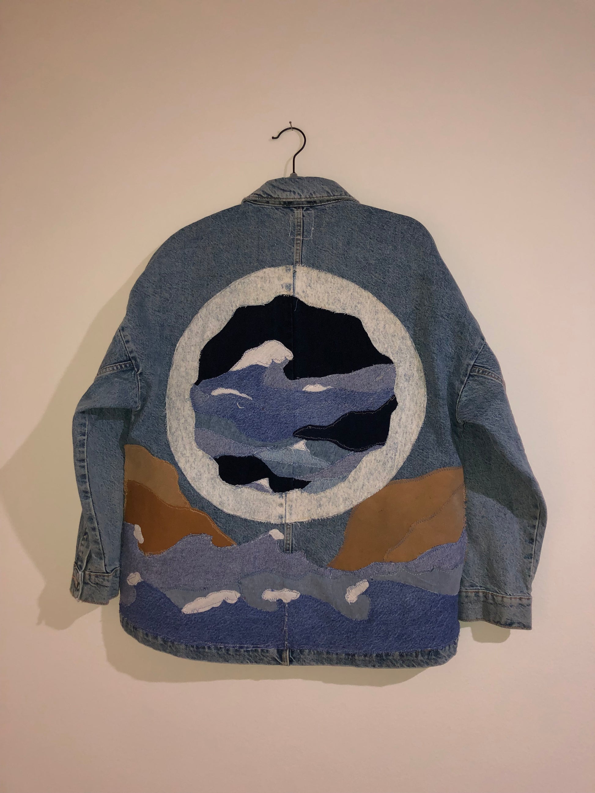 This one-of-a-kind vintage denim jacket is a wearable landscape, hand-crafted with intricate cut-and-sewn patchwork that brings the beauty of Catalina Island to life.