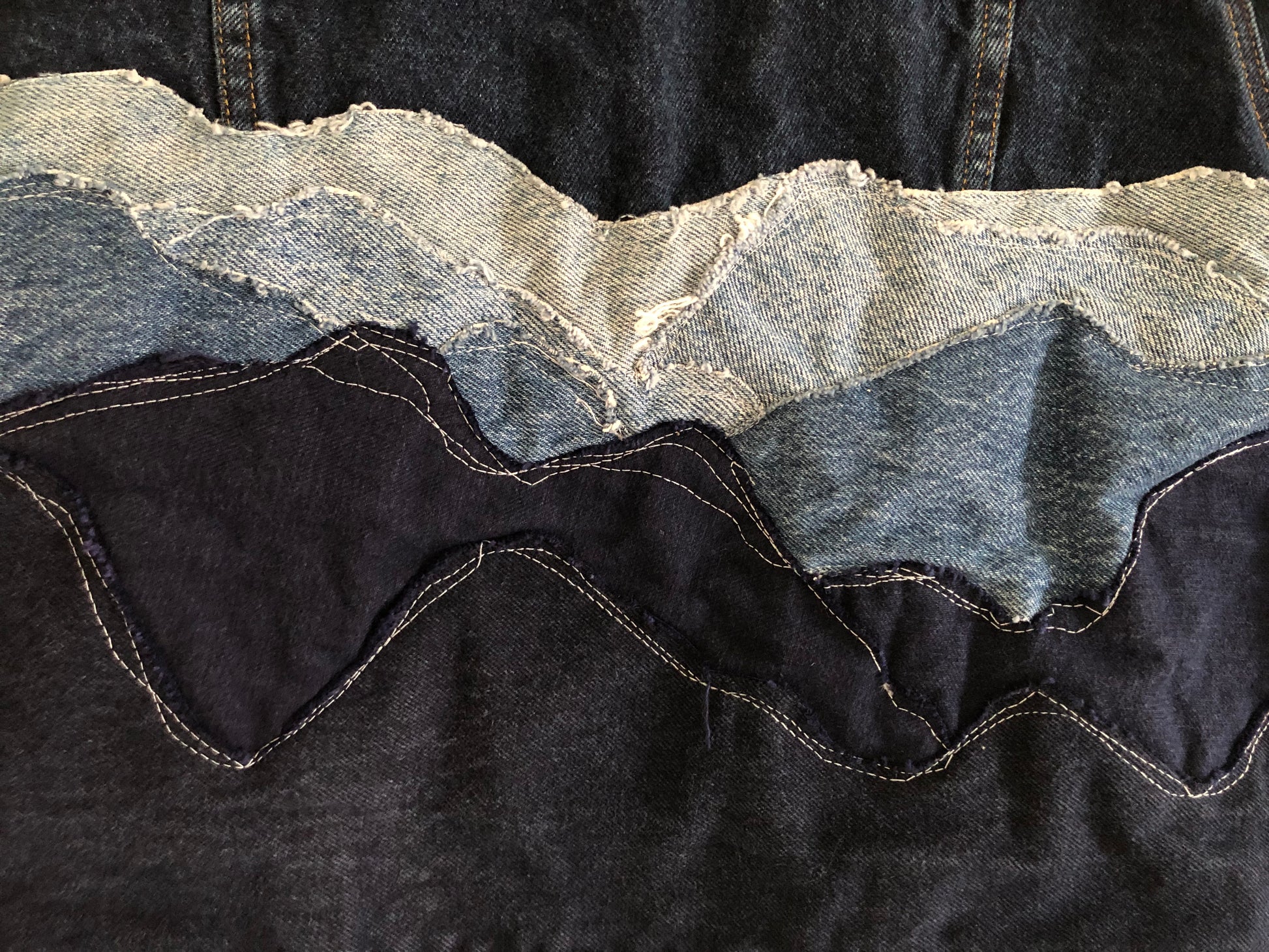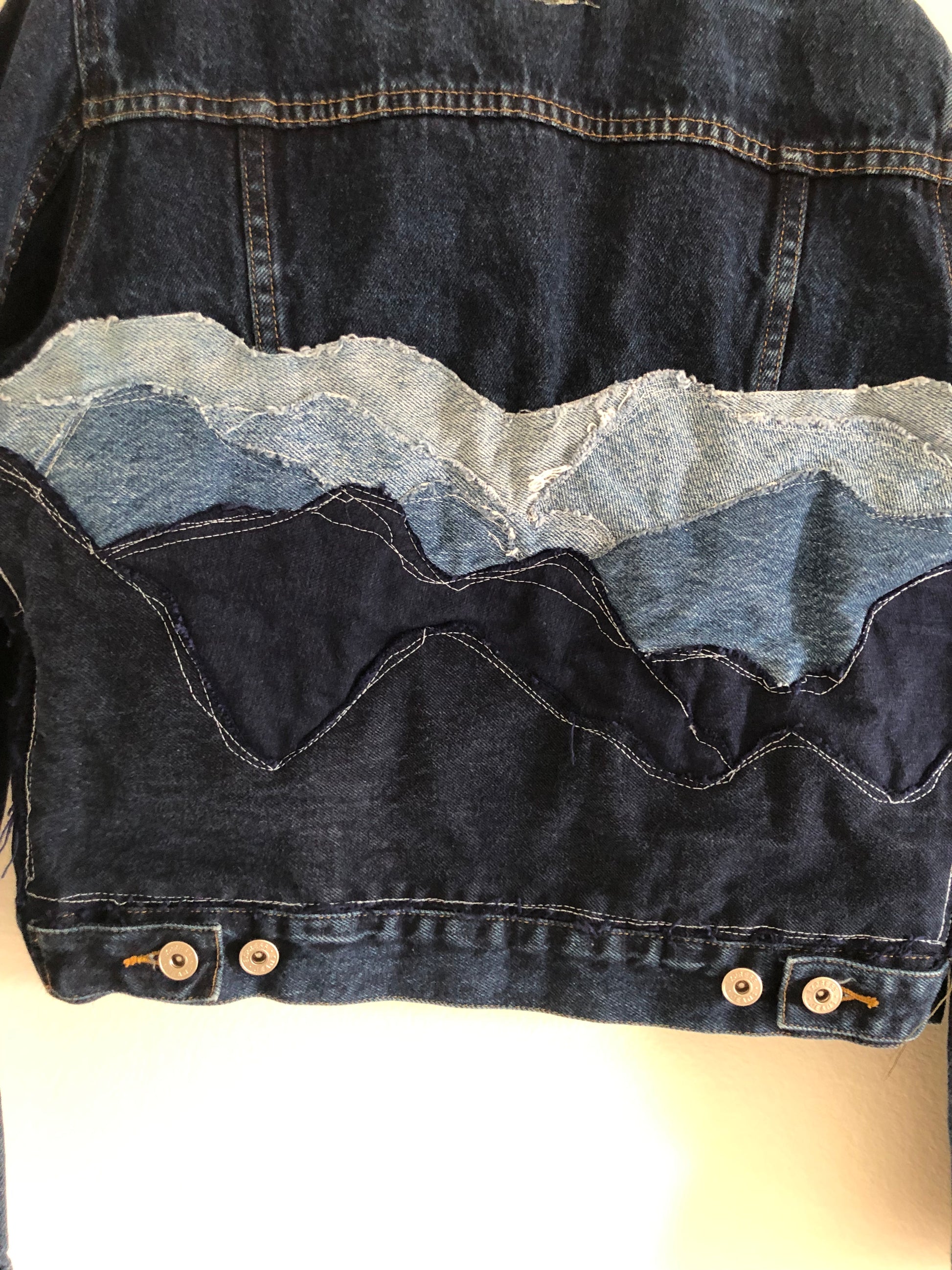 The Faded Morning Jacket captures the quiet beauty of dawn — that moment when the world is still, and the first light touches the peaks. Crafted from layers of reclaimed denim, its textured mountain design blends soft blues and deep indigos, mirroring the calm tones of an early morning sky.