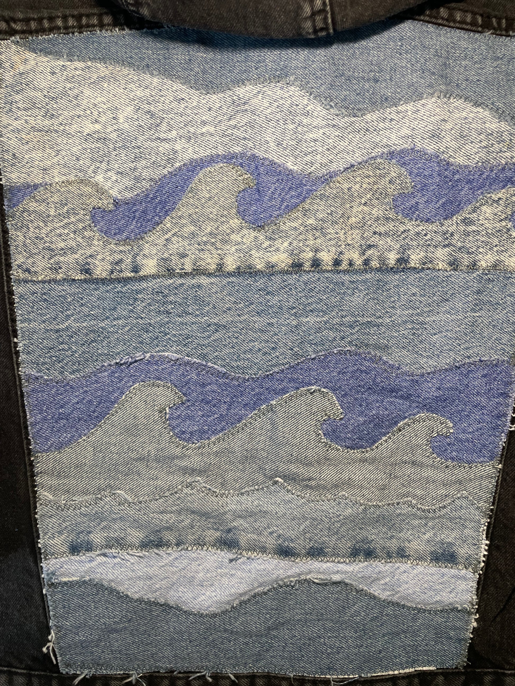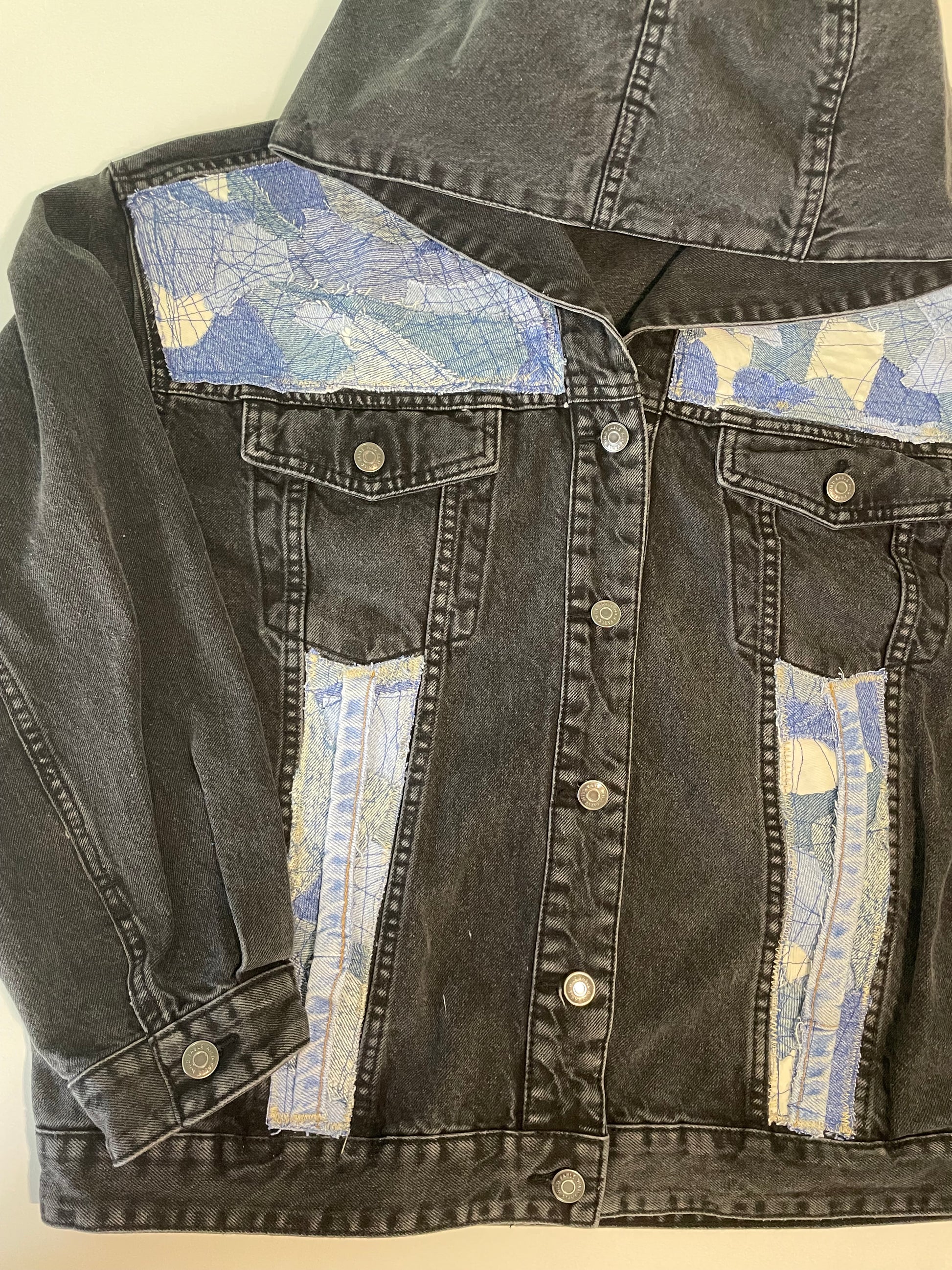 with a one of a kind blue stitched fabric block on the collar
