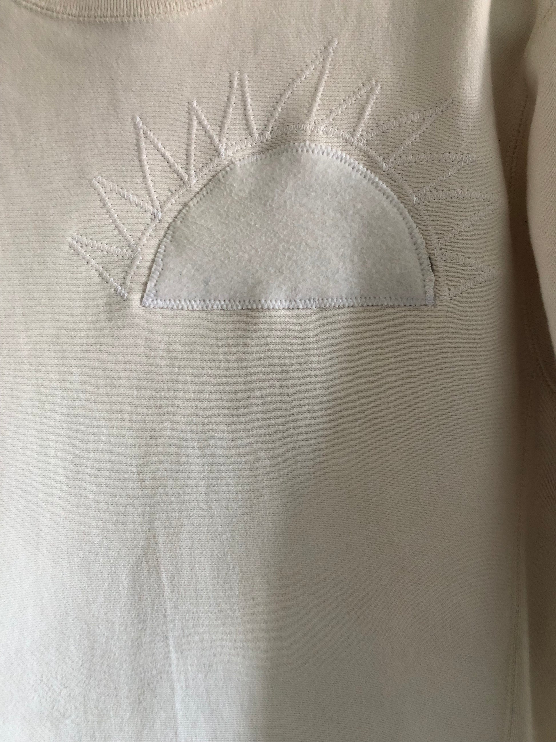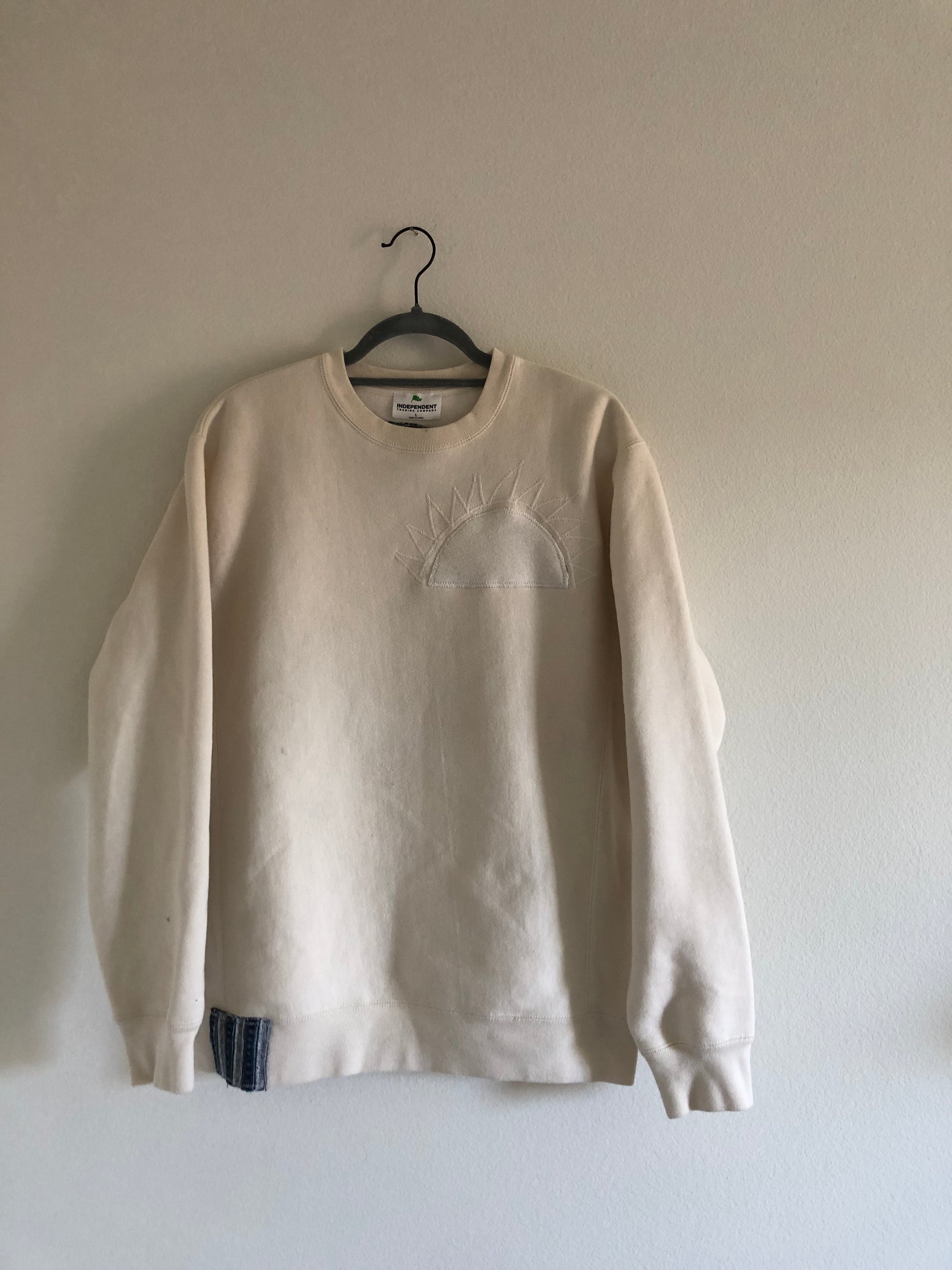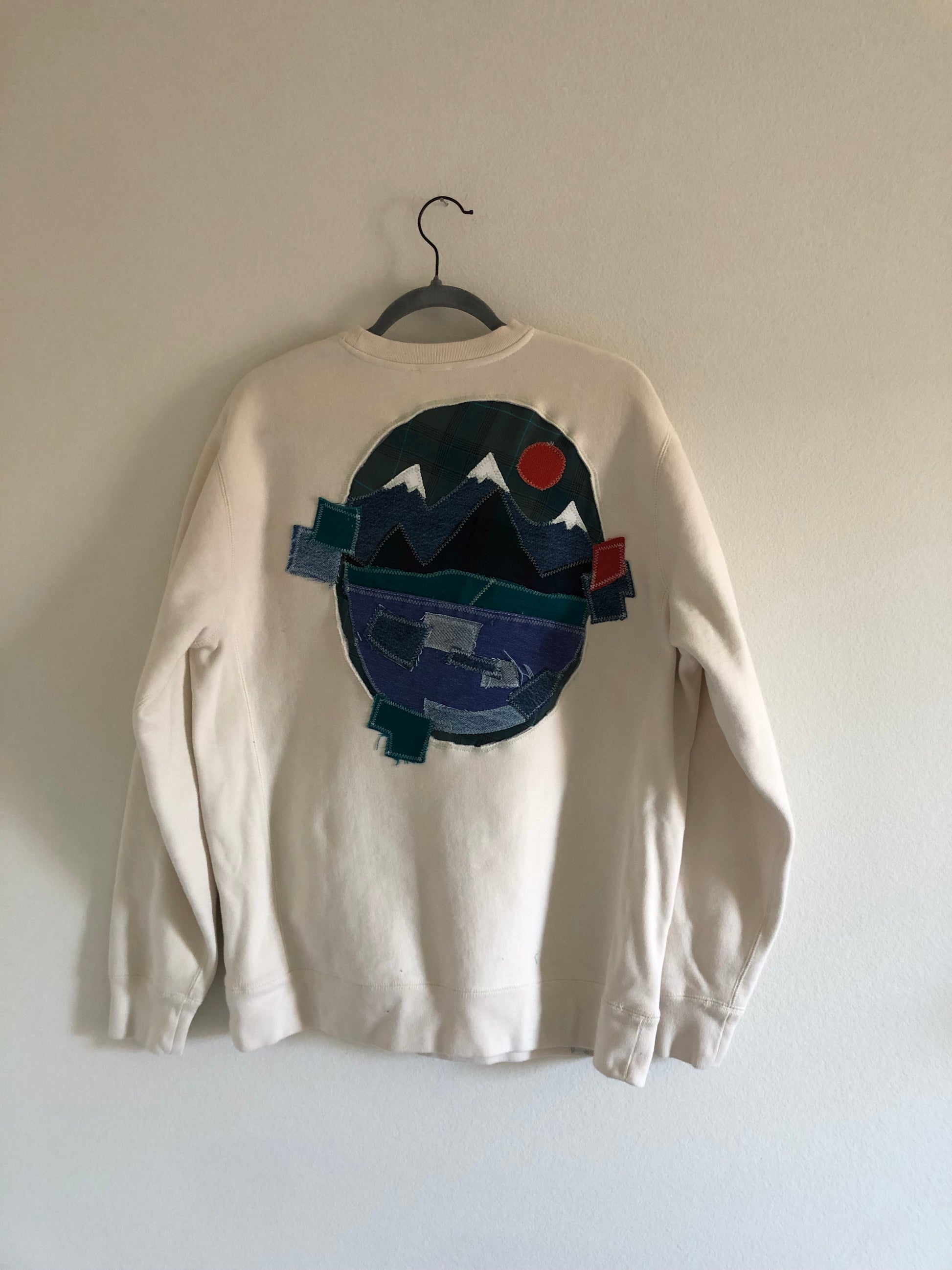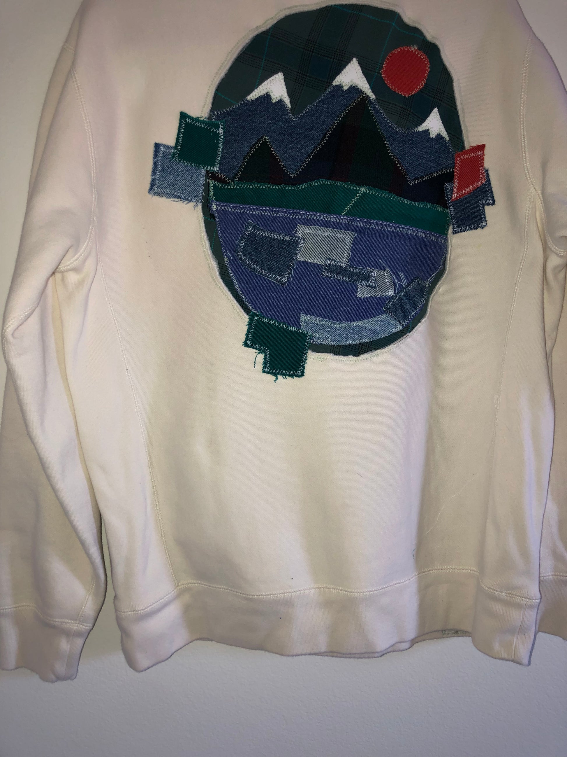 The Misty Mountains sweatshirt draws its inspiration from Tolkien’s timeless world — where peaks rise through the clouds and the horizon feels endless. Crafted on a soft cream base, this one-of-a-kind piece features a hand-stitched circular mountain scene on the back, pieced together from reclaimed denim, flannel, and corduroy. A subtle stitched sunrise graces the front, symbolizing light through fog and the beauty of the climb.