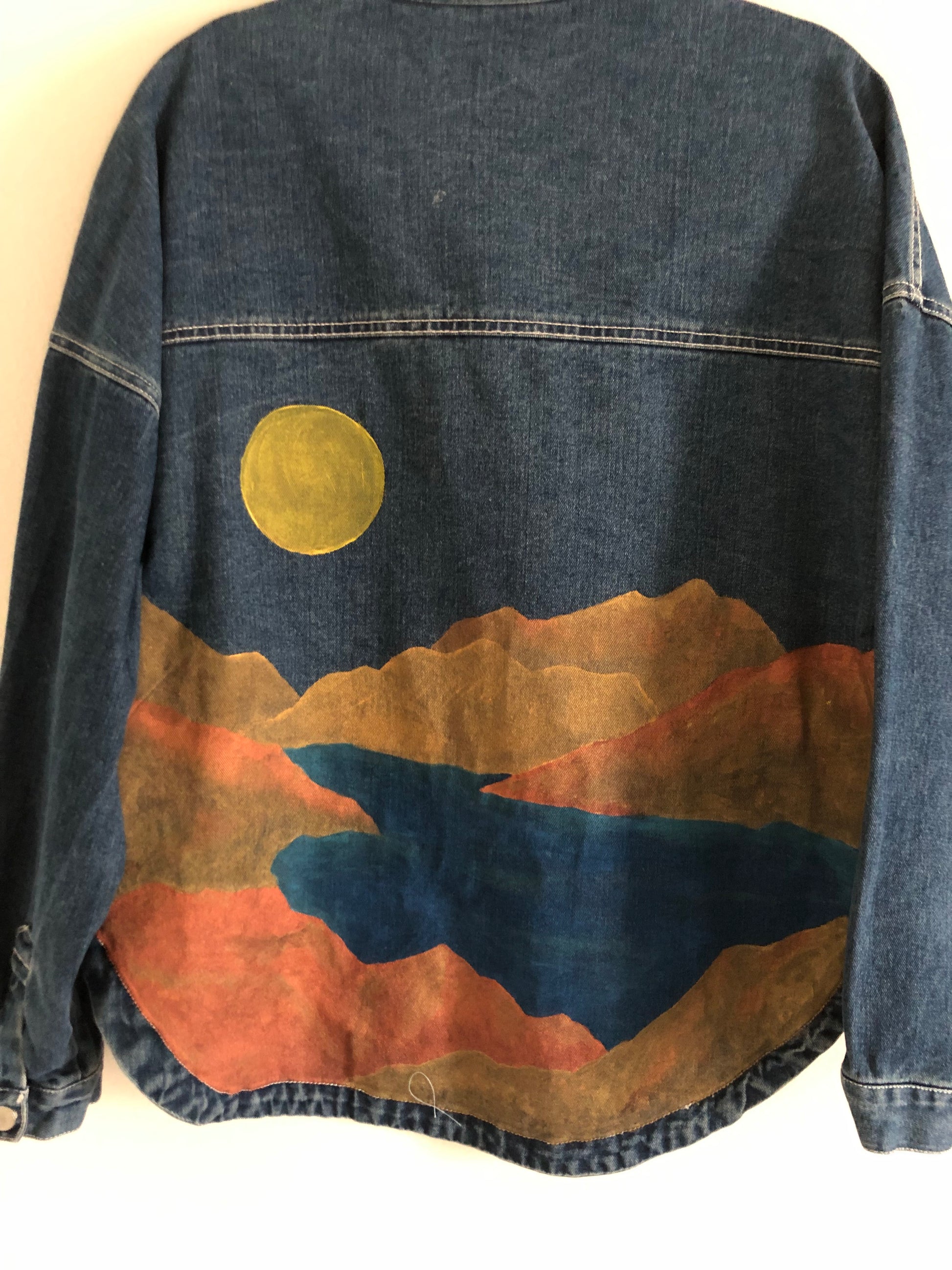 Style: Vintage denim button-down, hand-painted with a warm horizon design.